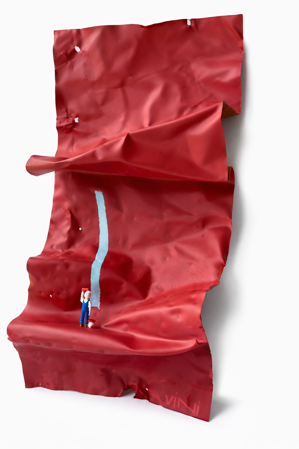 Intenso” captura o momento exato em que um gesto simples se transforma em presença. Um pequeno personagem traça um risco azul sobre o fundo vermelho intenso, criando um contraste que pulsa com energia e emoção. Cada linha é única, cada traço é carregado de decisão, lembrando que a intensidade não está apenas no tamanho, mas na força do ato. A obra celebra a coragem de marcar, de se expressar e de deixar sua presença no mundo, mesmo nos espaços mais amplos e silenciosos.